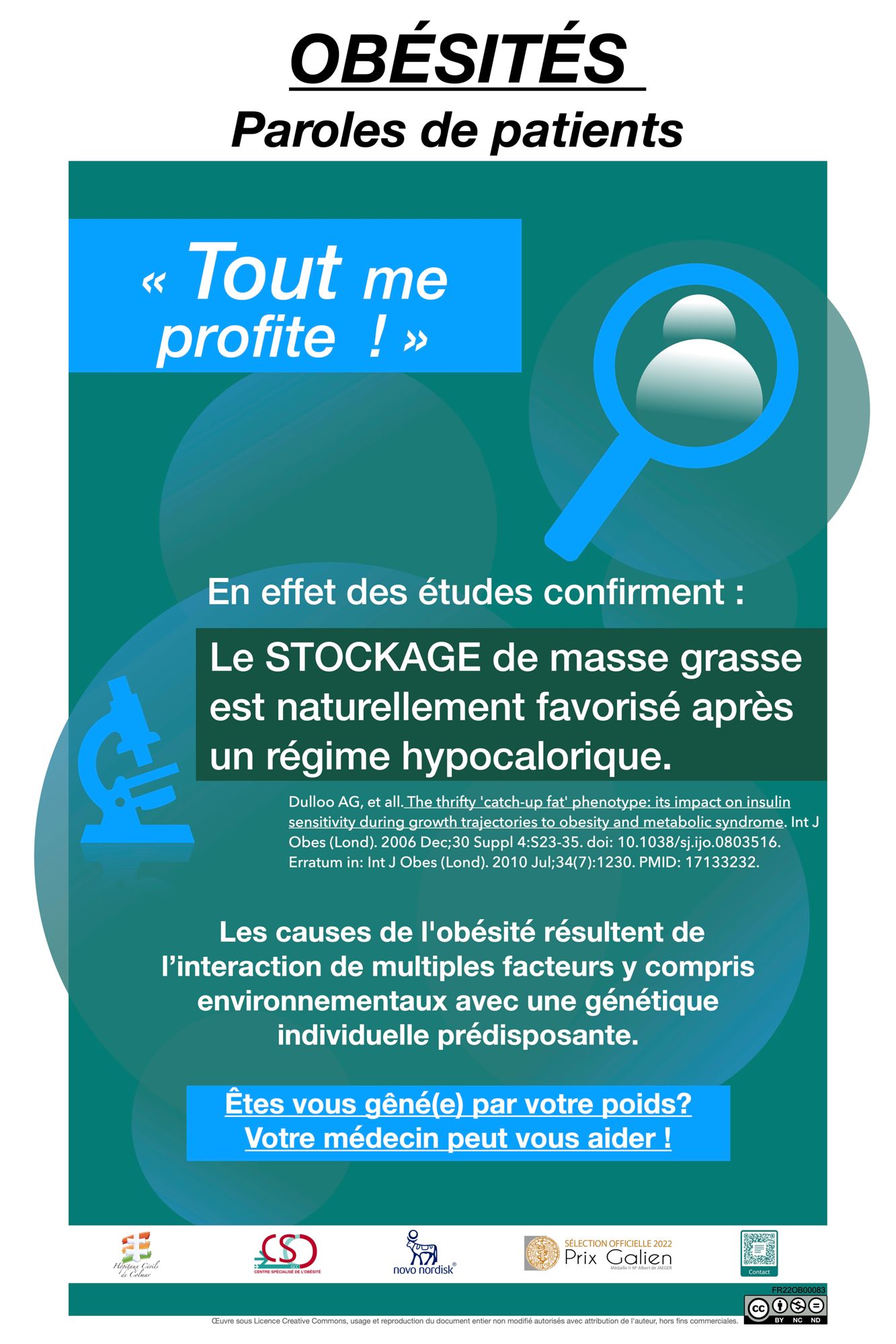 Il paraissait logique de rétablir la réalité, et valoriser la parole des personnes en situation d’obésité, en soulignant la vérité scientifique de leurs propos, illustrée par des publications internationales de l’Evidence Based Medicine. De la sorte, les mécanismes de régulation du poids et de la prise alimentaire sont explicités, permettant au public des affiches de comprendre que la réalité est plus complexe qu’on ne le pense, et le poids beaucoup moins dépendant de la volonté. Les préjugés tombent.