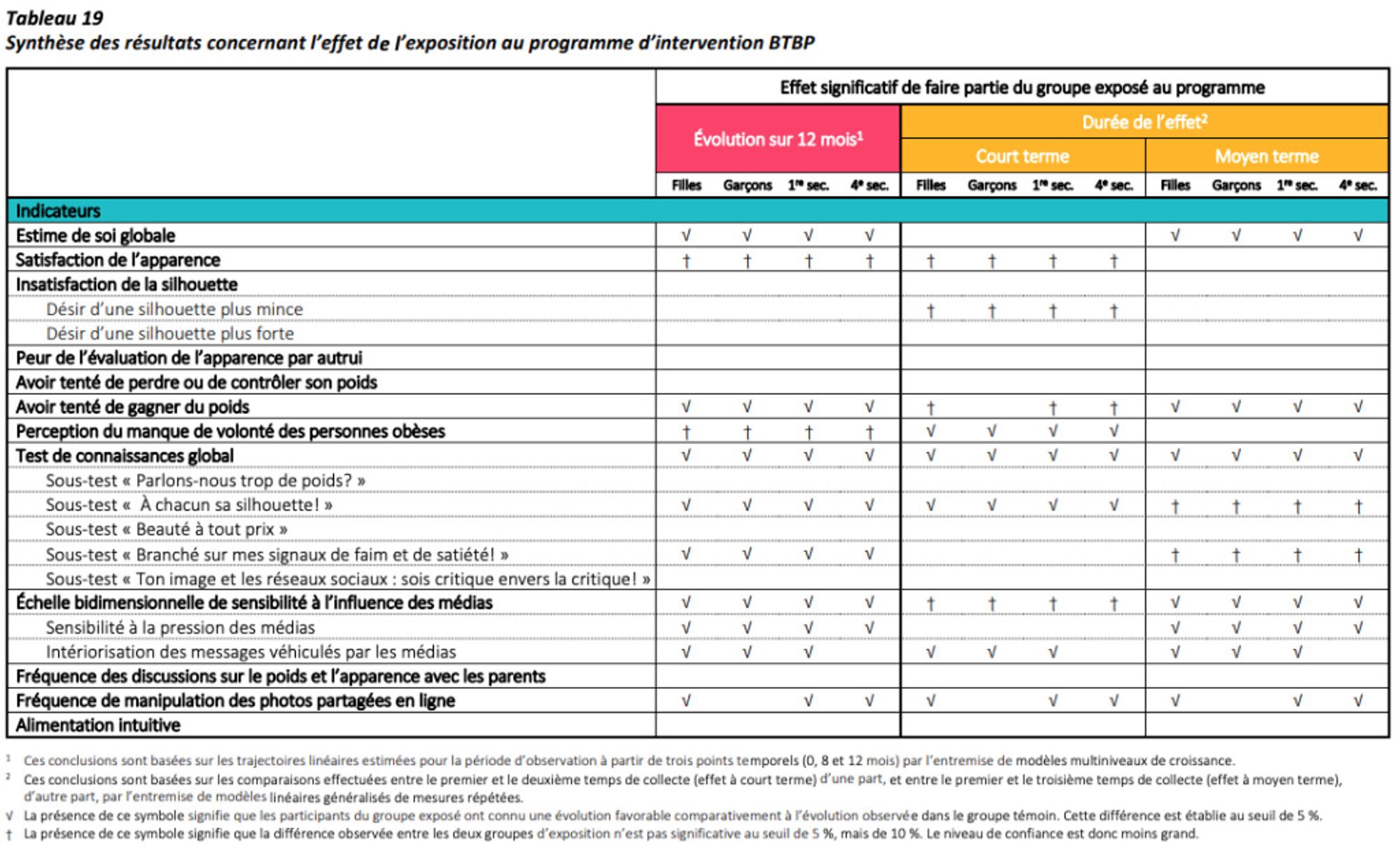 D’après l’étude, « les résultats obtenus témoignent de l’efficacité du programme à l’égard de certains indicateurs (par exemple l’estime de soi, les connaissances générales, l’influence des médias, etc.). L’objectif principal de la présentation de ces ateliers était non seulement de permettre aux jeunes de développer une image corporelle positive, mais également de les amener à changer de comportements afin d’adopter de saines habitudes de vie favorisant leur santé et leur bien-être. Bien que ces dernières cibles visant un changement de comportements n’ont pas été entièrement atteintes, il est important de noter qu’aucun effet négatif n’a été observé chez les jeunes ayant été exposés au programme d’intervention. Ces résultats sont d’autant plus intéressants que les deux groupes d’exposition étaient similaires quasi en tout point au départ, c’est-à-dire avant toute forme d’intervention. »