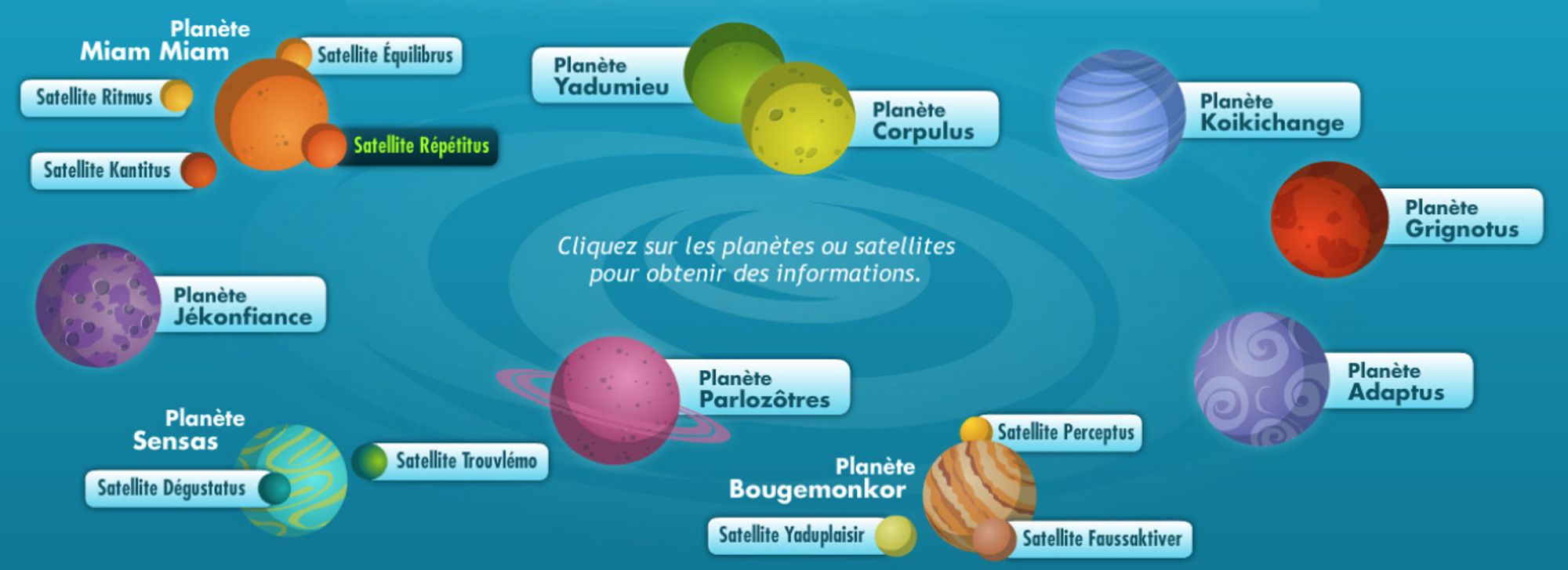 10 planètes à explorer représentent les 10 compétences dont l’évaluation est proposée. Ces planètes constituent la « Chalaxie ». Leur exploration sert de fil conducteur à la (aux) séance(s) d’évaluation.
